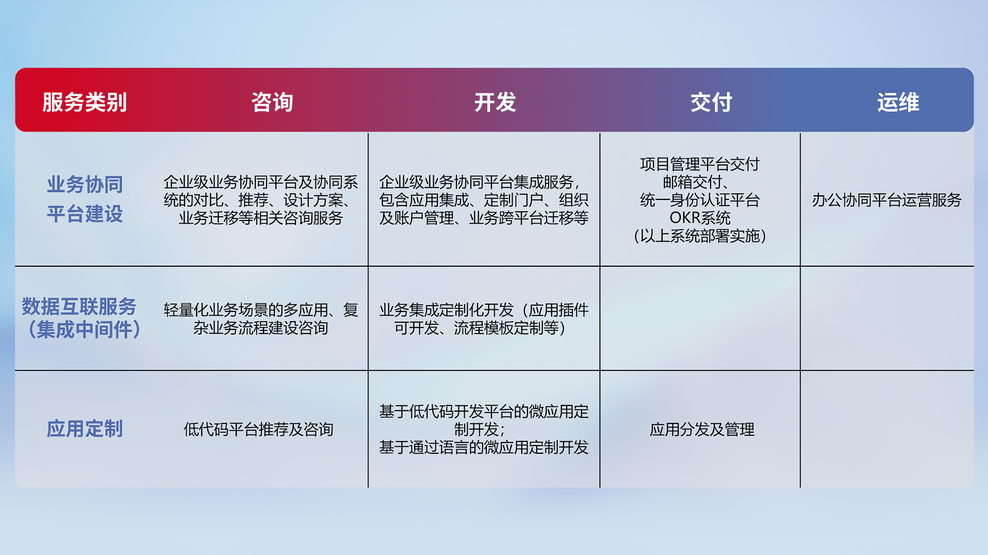 针对钉钉、、、企微、、、、IDaas等平台级产品提供产品的规划、、、方案、、交付、、、定制化开发等服务,,,,实现如统一协同办公、、智能客户服务、、混合会议管理、、、、智能数据查询、、、、等业务场景,,,实现数字化转型。。